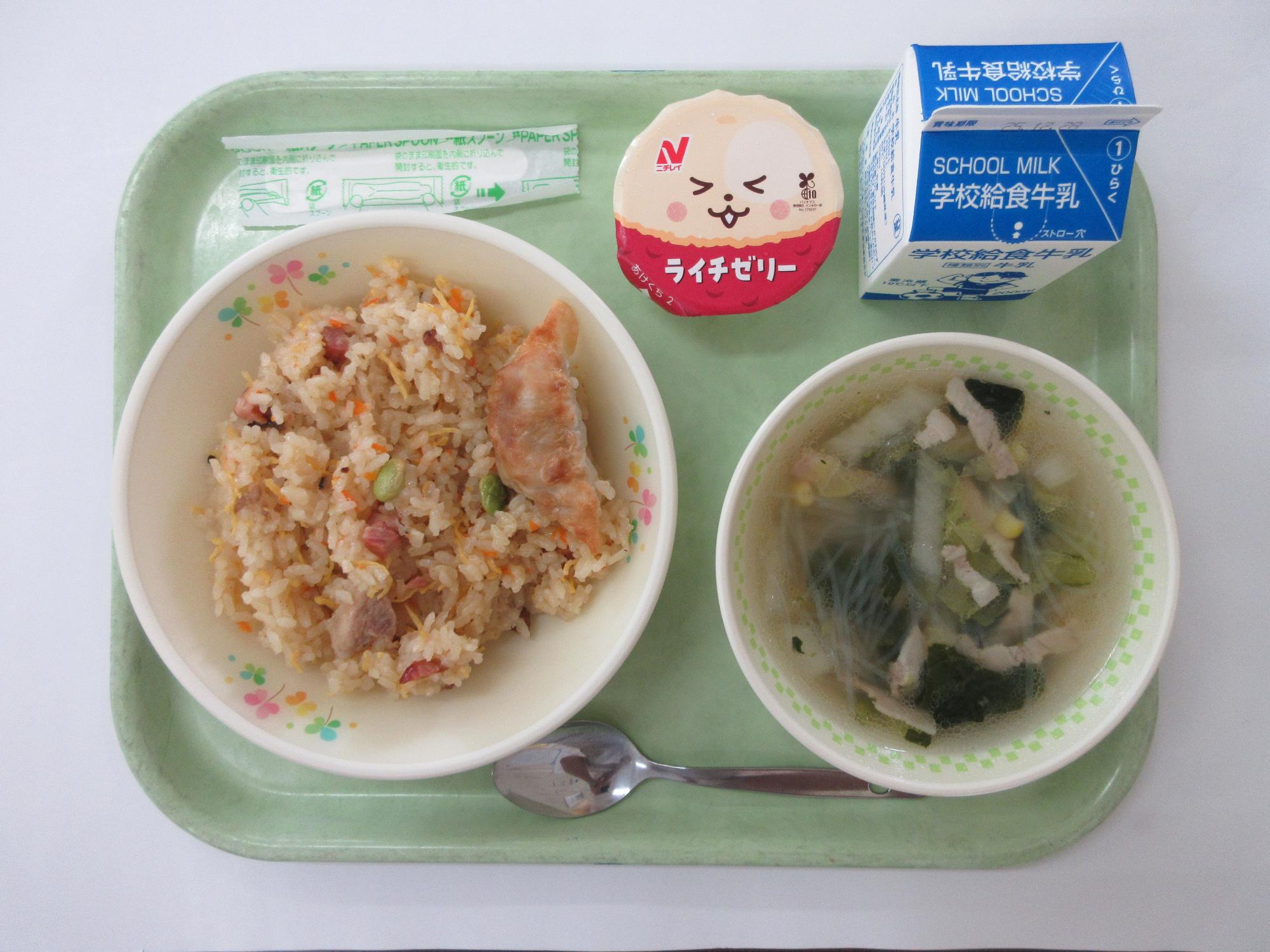 本日の献立は、炊き込みチャーハン・春雨スープ・ぎょうざ・ライチゼリー・牛乳です。