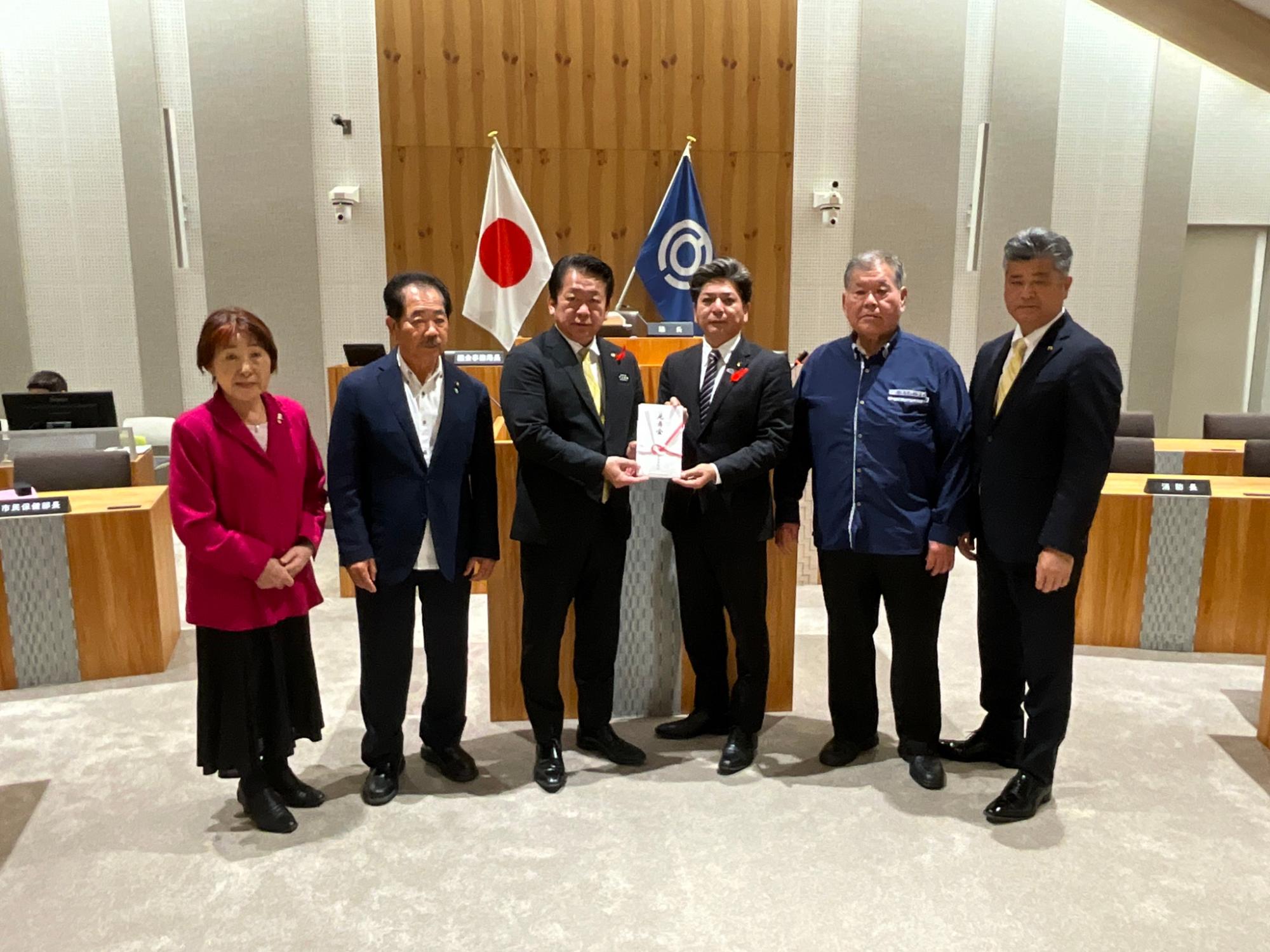 去る12月15日、先の街頭募金と議員からの見舞金を合わせた25万1,696円を12月定例会終了後、我喜屋議長から中山市長へ寄託しました。市に寄せられた見舞金と共に蘇澳鎮に届けられる予定です。