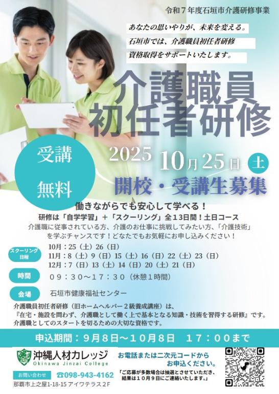 石垣市福祉事務所介護長寿課より介護職員初任者研修のお知らせです。