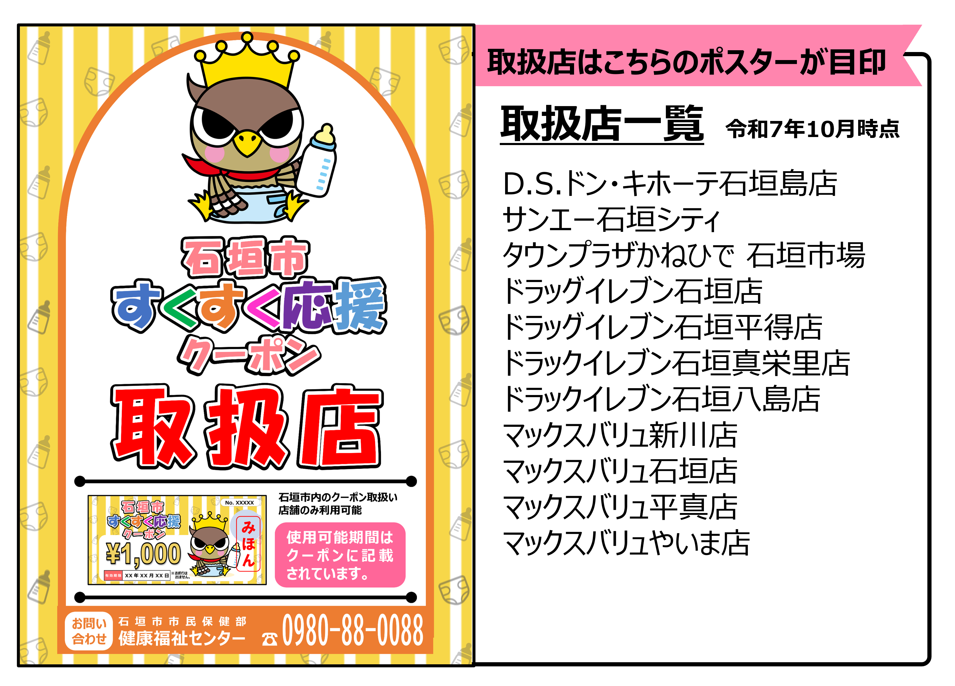 - すくすく応援クーポンは、石垣市内のクーポン取扱い店舗のみご利用できます。