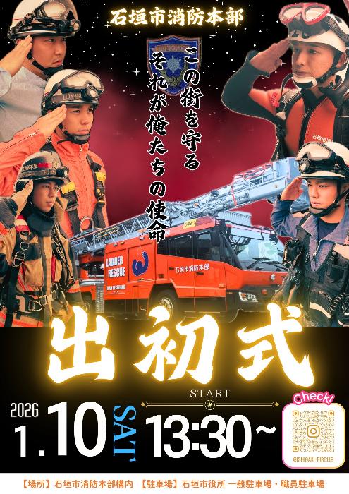 今年の出初式では、消防隊員たちのチームワークがウマく混ざり合った救助訓練をはじめ、展示コーナーも準備しております。さらに、一斉放水では、石垣島出身アーティストのヒット曲や子供たちの大好きな曲に合わせての演出をお楽しみください。皆さまお誘いあわせのうえ、ご来場を心よりお待ちしております。