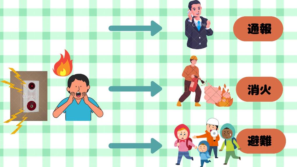 同時に119番通報をする人、お客様や従業員の避難誘導を行う人で分担して活動します。