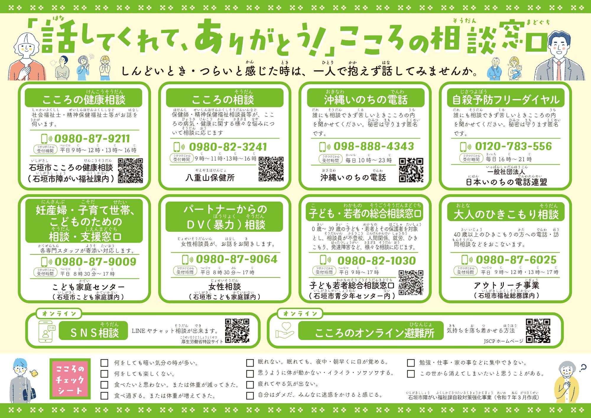 石垣市内では、「こころの相談」が可能な場所が数か所あります。また全国的にはSNS等での相談が出来るところもあります。