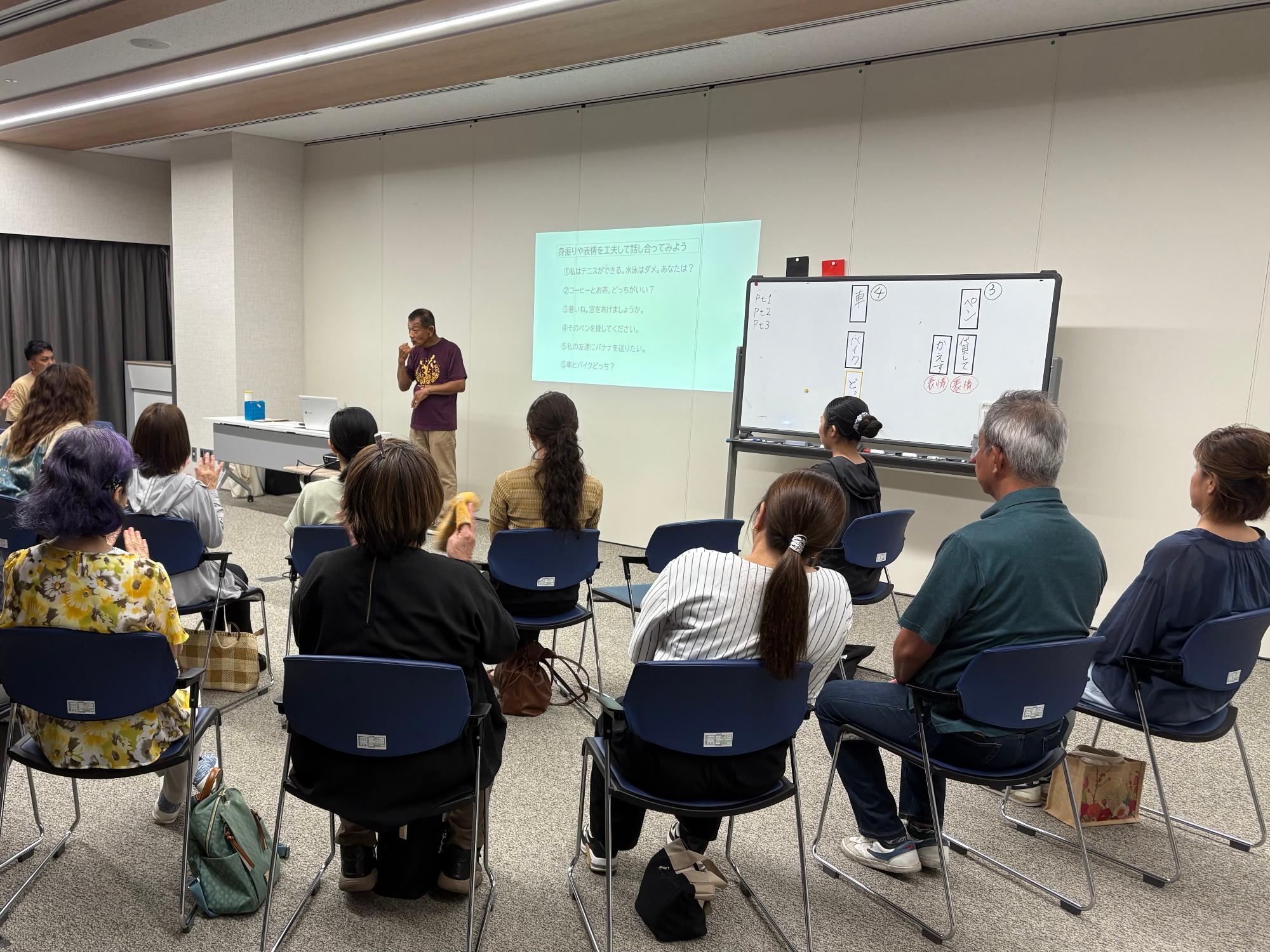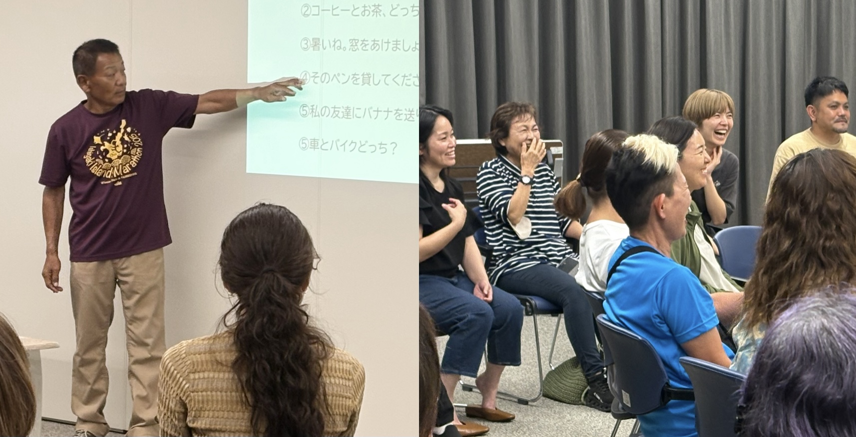 7月30日は津波注意報発令で残念ながら休講になりましたが、30名の受講生が初めての手話を楽しく体験しました。