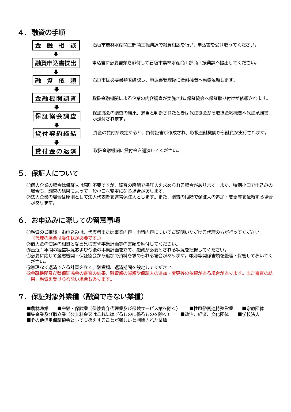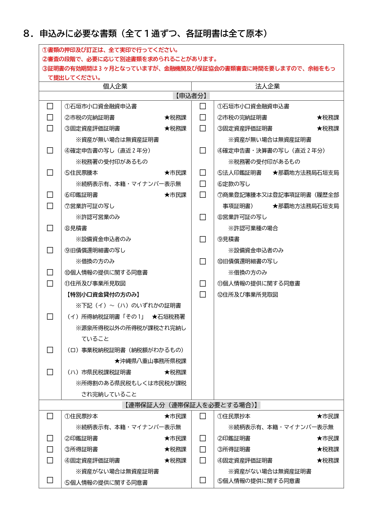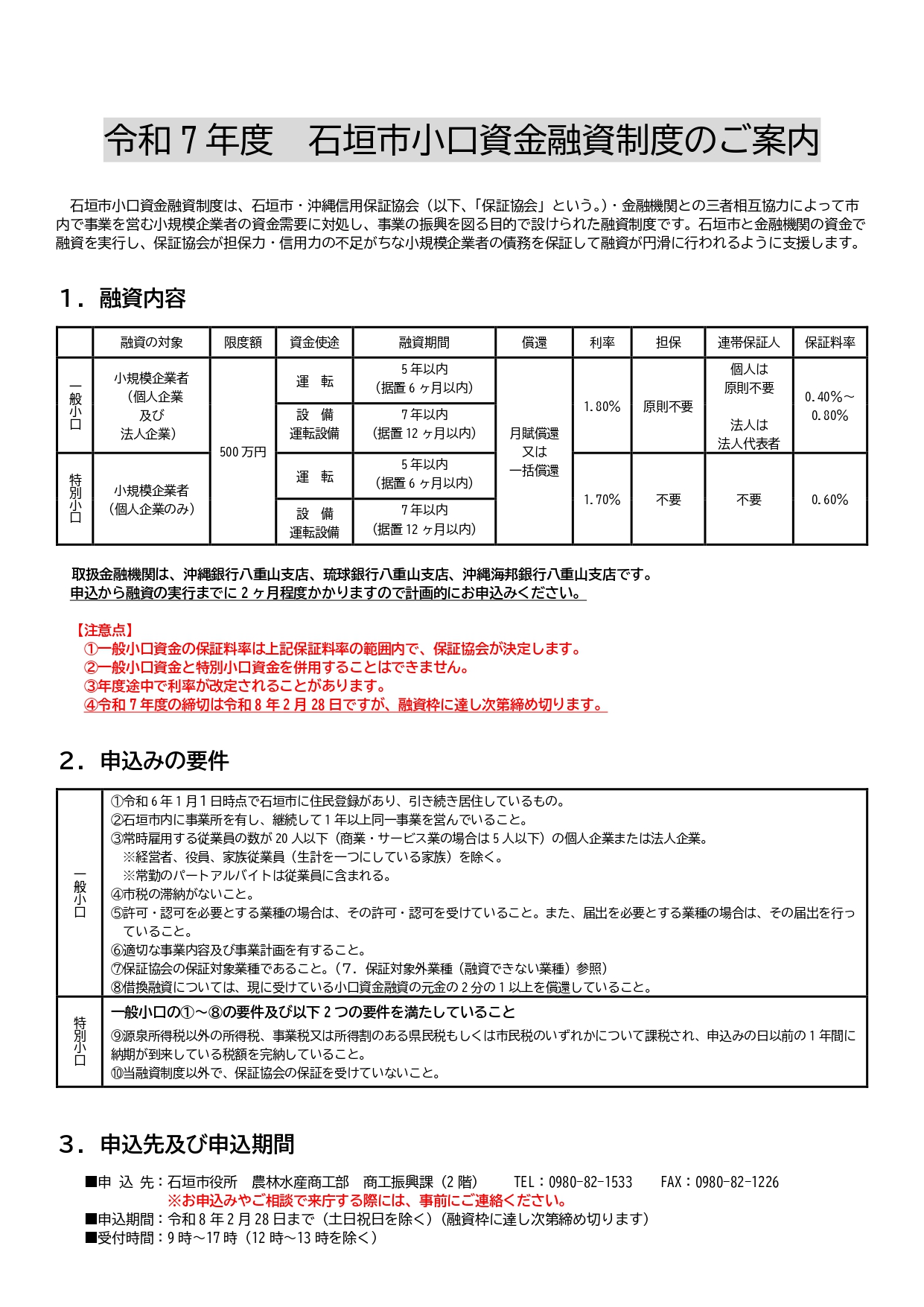 令和7年度 石垣市小口資金融資制度のご案内 Tweet 更新日:2025年11月21日 関係書類 1.ご案内 (PDFファイル: 383.0KB) 2.相談票 (PDFファイル: 75.1KB) 3.申込書 (PDFファイル: 79.0KB) 4.個人情報同意書 (PDFファイル: 78.9KB) 5.住所見取図 (PDFファイル: 76.2KB) 6.委任状(代理の方が申し込みをする場合) (PDFファイル: 55.3KB) 7.個人情報同意書(沖縄県信用保証協会) (PDFファイル: 225.3KB) この記事に関するお問い合わせ先 農林水産商工部 商工振興課 商工係〒907-8501 沖縄県石垣市字真栄里672番地電話番号:0980-82-1533メールフォームによるお問い合わせ