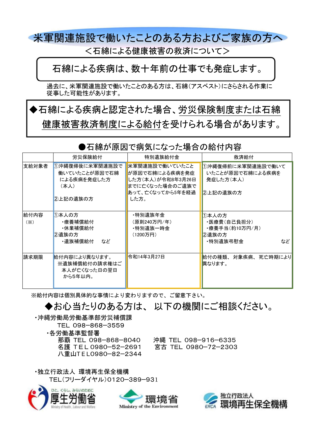米軍関連施設で働いたことのある方及びご家族の方へ~石綿(アスベスト)による健康被害救済について~