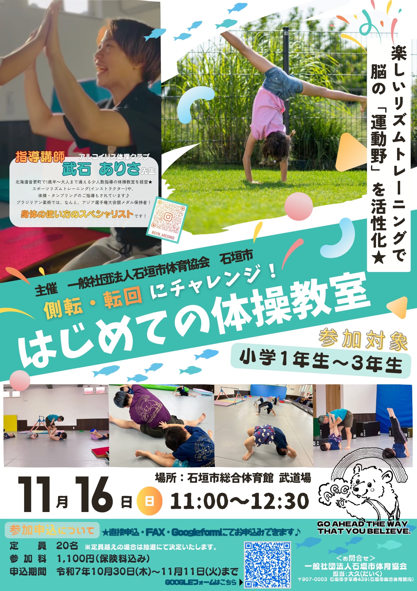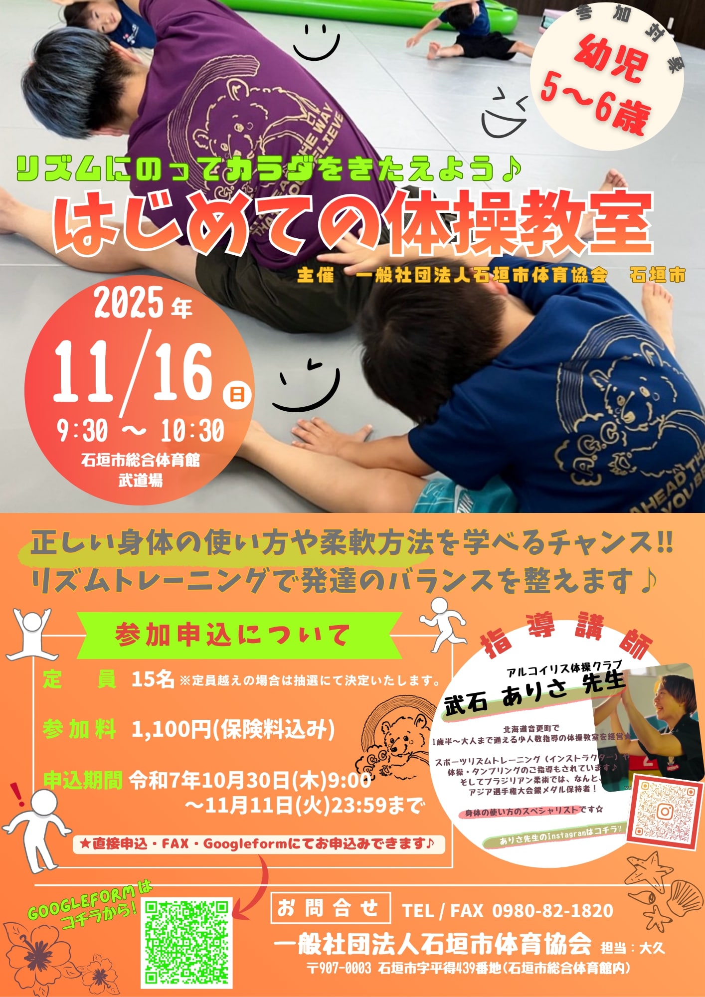スポーツリズムトレーニングで脳を活性化しながら、マットや跳び箱、平均台などの器具を活用して正しい身体の使い方や柔軟方法について学べるチャンス‼最近涼しくなってきた石垣島の『スポーツの秋🍂』にぴったりな体操教室です。ぜひご参加ください♪